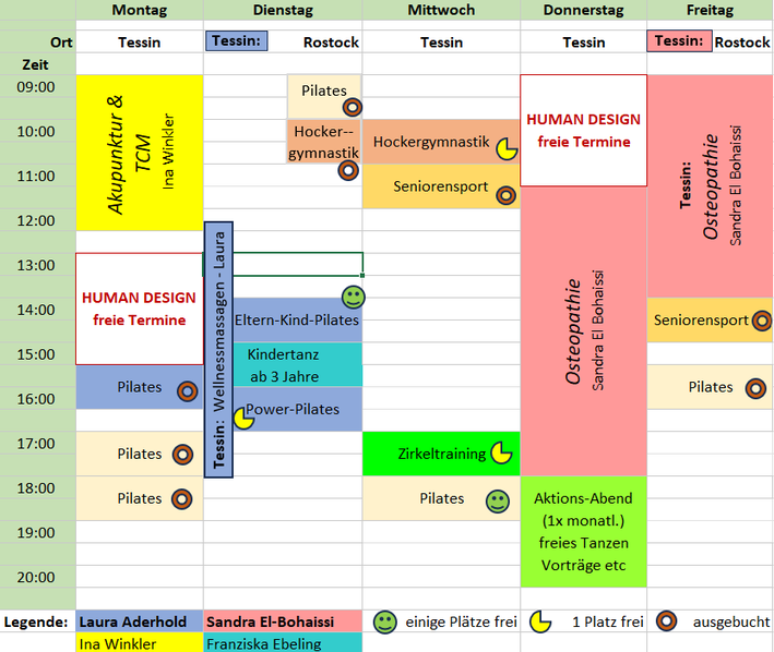 Alle Kurse finden in Kleingruppen statt (4-8 Teilnehmer). Wir machen Übungen auf der Matte im Liegen, Stehen und Sitzen. Matten sind vor Ort. Bitte bequeme Sportkleidung und ein großes Handtuch mitbringen. Turnschuhe sind nicht erforderlich.